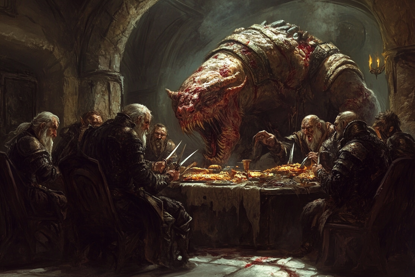 Prompt: in the master's chambers, they gathered for the feast. They stab it with their steely knives, but they just can't kill the beast